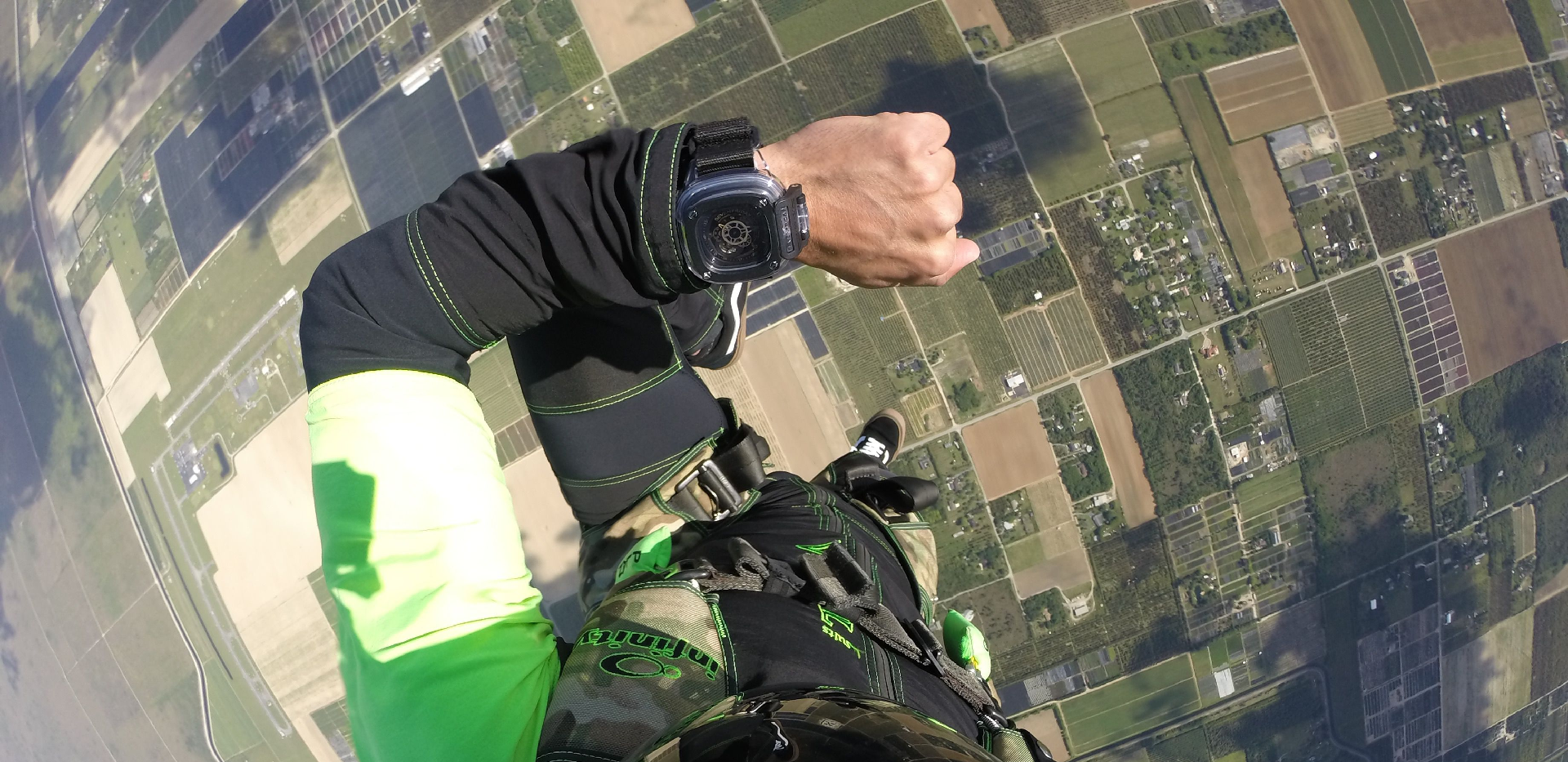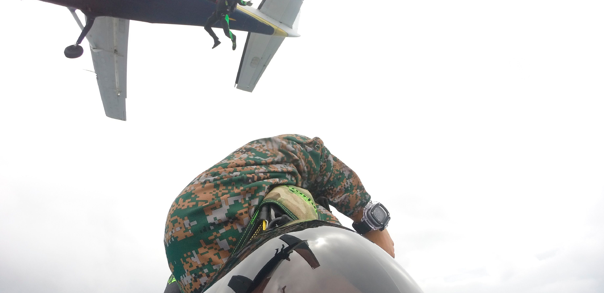 Climbing to an altitude of 13,500 Gabriel pulls open the sidedoor, action 3,2,1 and jump! Falling backwards down to earth, the plane he was in disapears in seconds. Freefalling with his speed increasing from 100 to 150 then 200 and hitting 216mph (347kmph) before deploying his pilot chute. His parachute explodes from it’s pack, jolting him up and instantly reducing his speed. Spotting the landing zone he navigates downward while circling around the target. Landing perfectly in stride, Gabriel looks up to the sky he just fell from. That was one jump, bring on the next 5 before lunch!