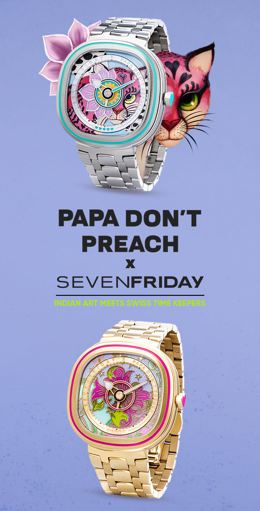 - Dial: Three layers construction. Dial displaying an Indian Leopard Cat décor, exclusively designed by PDP for SEVENFRIDAY. Applied dial ring in galvanic rhodium, engraved SEVENFRIDAY X PAPA DON`T PREACH highlighting the official collaboration