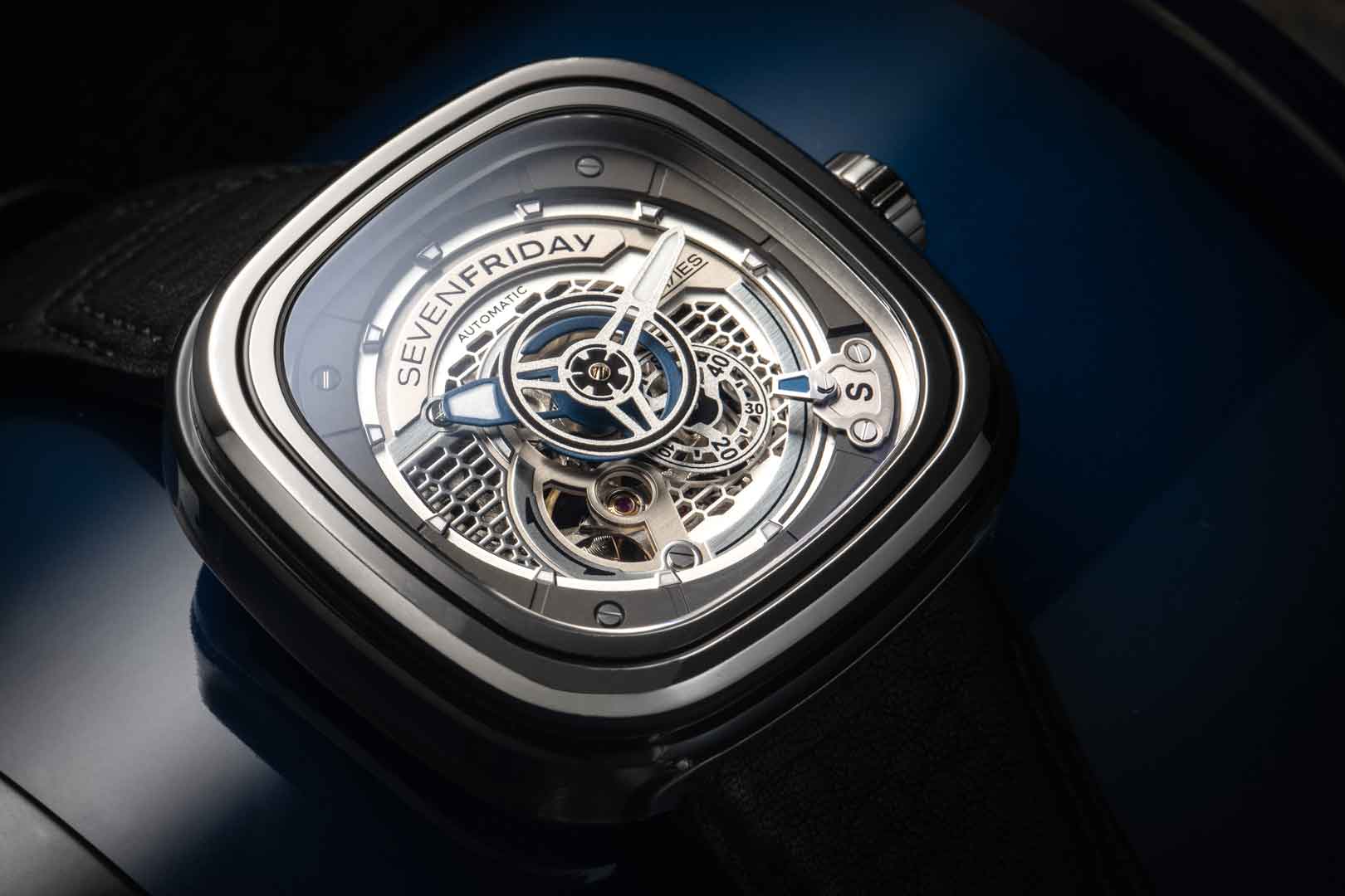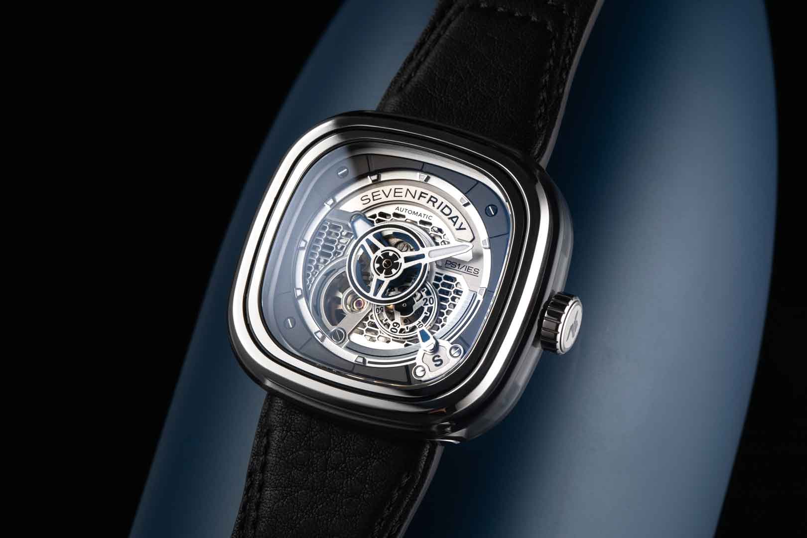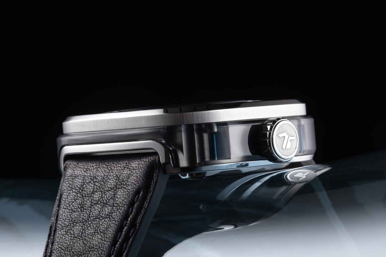 As a nod to clean industries, the PS1/01 is a evolution of the S1/01 and it brings the industrial essence into clear focus. With recycling emerging as a result of industrial design, the recyclable number 7 specific animation ring reveals the conscious construction. The smoky grey translucent nylon allows the stainless steel body and fixing screws to be seen for the first time. The interface is stripped back to show the complete engine and the hands have been designed with metallic blue and Super-Luminova® for optimal visibility