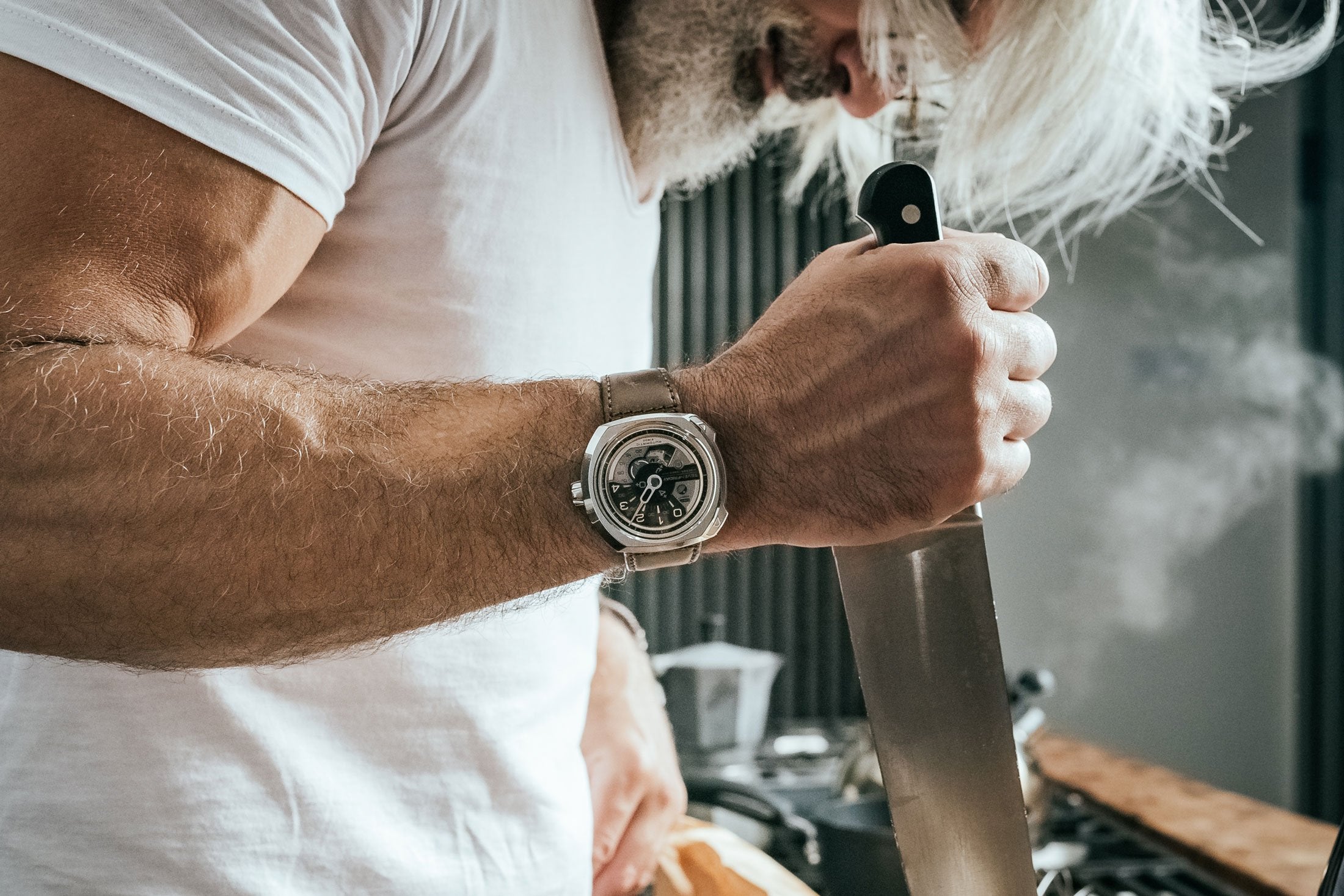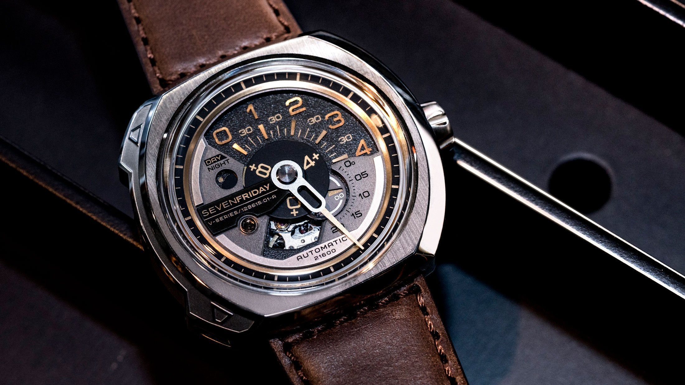 Inspired by barometers on industrial machines, the V2/01 takes advantage of its multifunctional yet precise design and features a polished stainless steel case with sandblasted and vertically brushed finishing. The four layers of alternating discs in shades of grey and copper elements use the “additioner principle” to indicate time by adding 0+, 4+ and 8+ to the 0-4 scaled 120° hour indicator and summing 00, 20+, 40+ on the 00-20 seconds disc