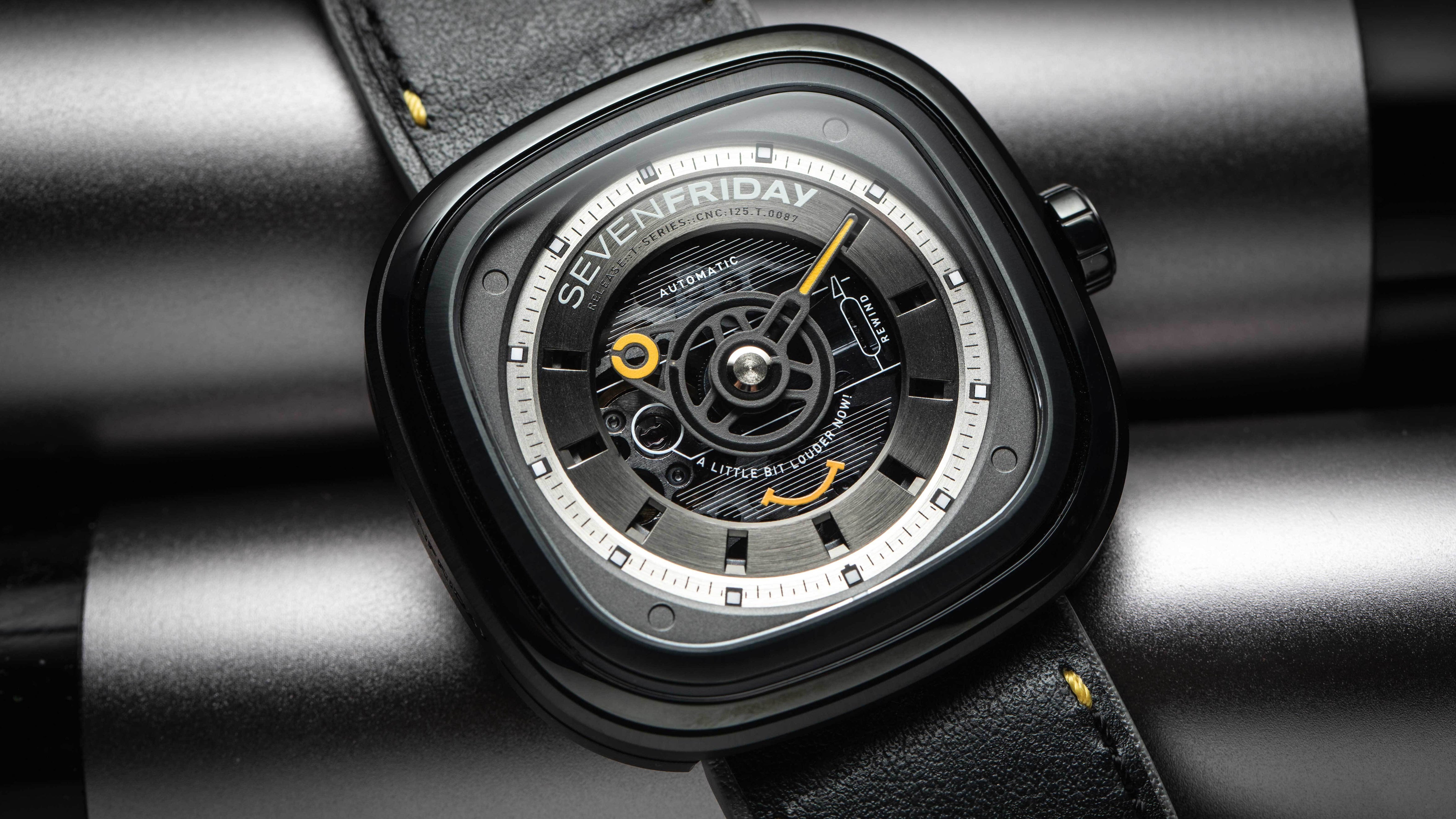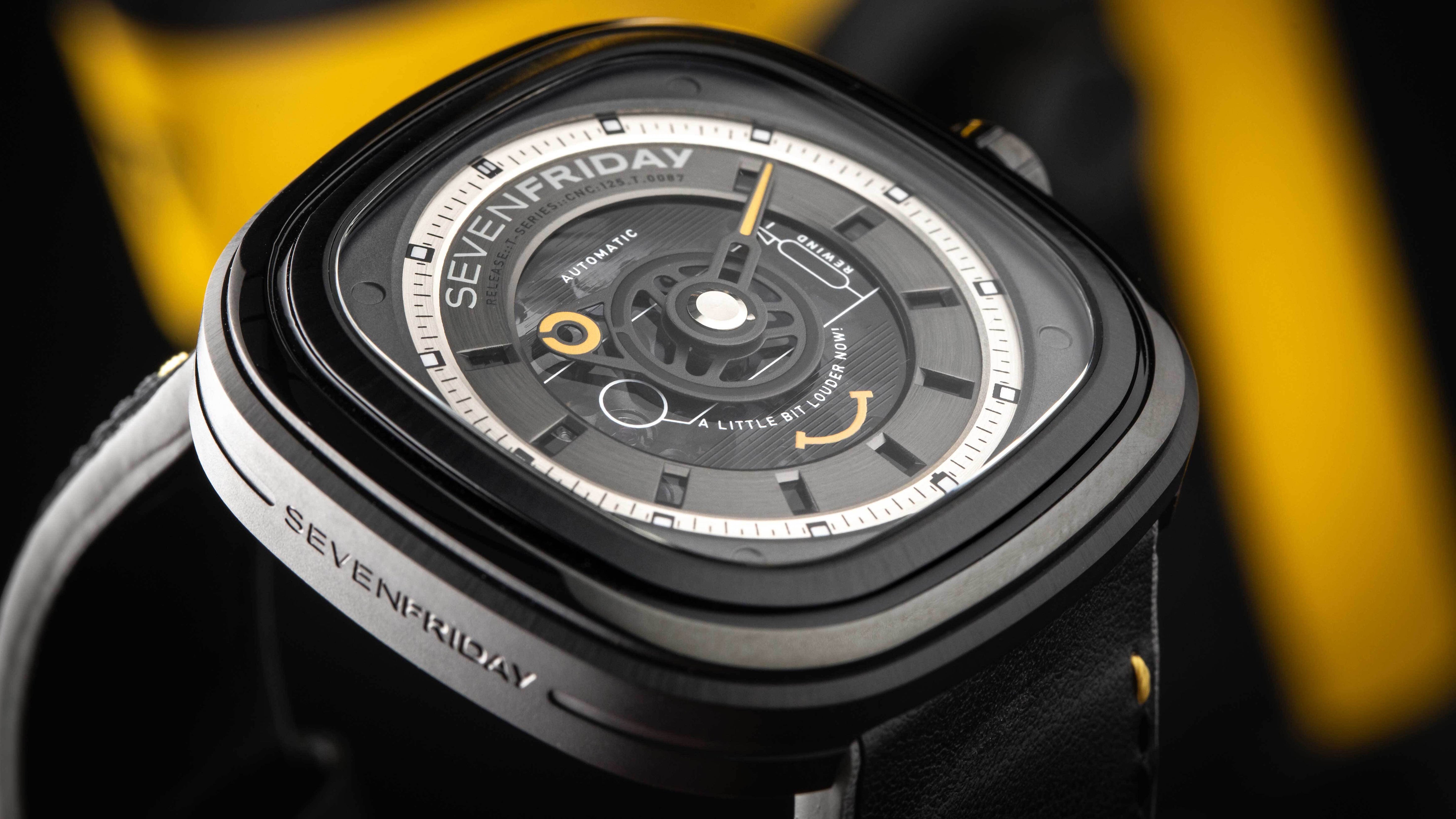 • Animation ring: Circular brushed intermediate ring, cut out indexes from 2 to 10h, SEVENFRIDAY logo in relief printing, Double layer dial ring, beveled inner circle in brushed rhodium with 12 luminous printed tracks, Outer plate in hard sandblasted gun metal finishing